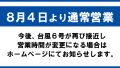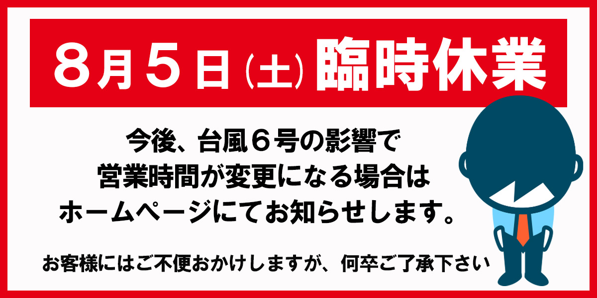 8月5日土曜日は臨時休業いたします お知らせ 2023.08.05 大型台風6号の再接近に伴いまして、8月5日土曜日の営業を臨時休業とさせて頂きます。 台風の進路状況によっては、今後の営業時間が変更になる可能性があります。その際は、変更が決まり次第、ホームページにてお知らせいたします。お客様の皆様にはご迷惑をおかけしますが、ご理解のほど何卒よろしくお願いいたします。
